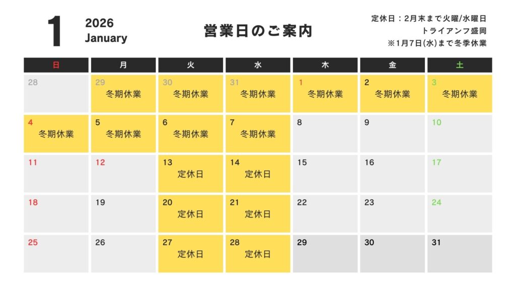 Home > ニュース > トライアンフ盛岡 2026年 1月営業日のお知らせ